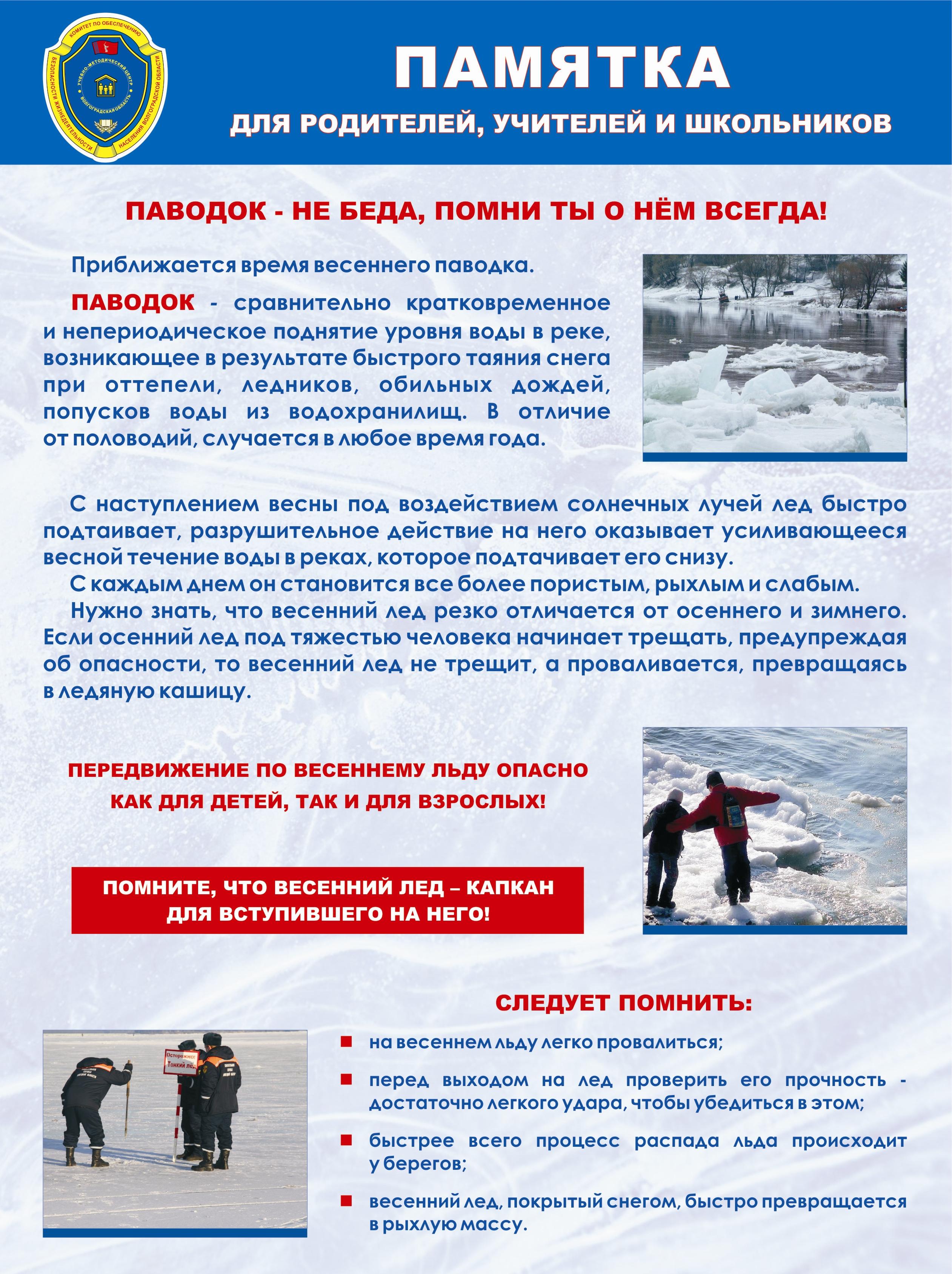 - будьте готовы к эвакуации! Без промедления выходите в безопасное место, при этом учитывайте направление вероятного развития паводка;